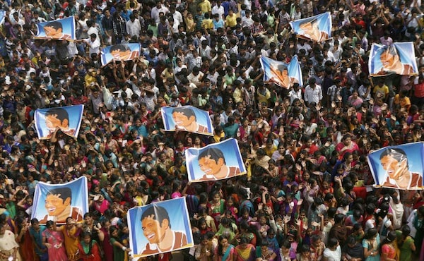 Indian school children display posters of Indian cricket player Sachin Tendulkar as they gather to honor him in Chennai, India, Thursday, Nov. 14, 2013. Tendulkar plays his world-record 200th and last test Thursday.Arun Sankar K/The Associated Press