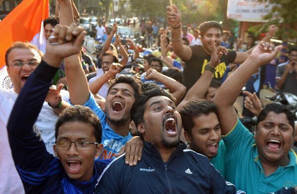 Indian fans celebrate after India won the 2015 Cricket World Cup's cricket match against Pakistan, on the streets of Mumbai on February 15, 2015. Jubilant fans spilled out onto India's streets and let off firecrackers after the national team defeated bitter rivals Pakistan in their opening World Cup match in Adelaide on Sunday.PUNIT PARANJPE/AFP / Getty Images