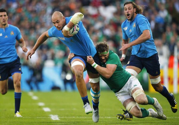 Italy’s Sergio Parisse tries to shake off Ireland’s Jamie Heaslip during their Pool D match at Olympic Stadium in London on Oct. 4.Eddie Keogh/Reuters