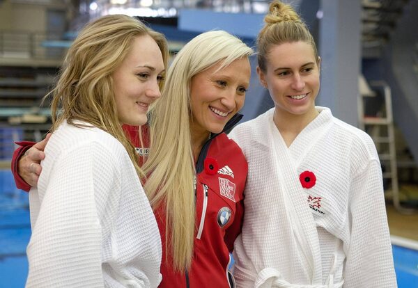 Kaillie Humphries, centre, poses with teammates Melissa Lotholz, left, and Genevieve Thibault in Calgary on Nov. 11.Jeff McIntosh/The Canadian Press