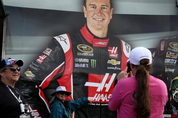 Fans are seen near the Stewart-Haas Racing souvenir truck, featuring a photo of Kurt Busch on the side during practice for the NASCAR Sprint Cup Series 57th Annual Daytona 500 at Daytona International Speedway on Feb. 21 in Daytona Beach, Fla.Patrick Smith/Getty Images