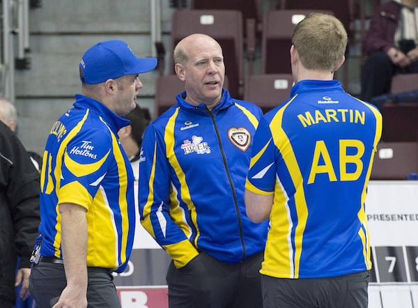 Alberta coach Kevin Martin, centre, talks with Darren Moulding, left, and his son Karrick Martin on Monday in St. John’s.Andrew Vaughan/The Canadian Press