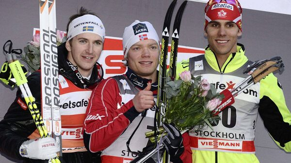 t placed Eirik Brandsdal (C) of Norway, Second placed Teodor Peterson (L) of Sweden and third placed Len Valjas of Canada pose on the podium after winning the Men's 1 km Classic Sprint Final at the FIS Cross-Country World Cup in Stockholm March 14, 2012. REUTERS/Claudio BrescianiClaudio Bresciani/Reuters