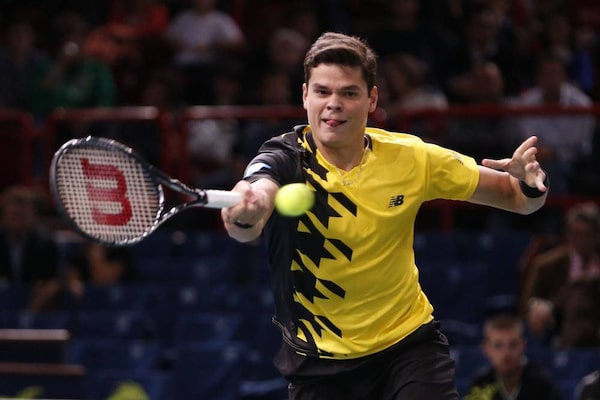 Milos Raonic of Canada hits a return to Robin Haase of the Netherlands at the Paris Masters men's singles tennis tournament at the Palais Omnisports of Bercy in Paris, October 30, 2013.CHARLES PLATIAU/Reuters