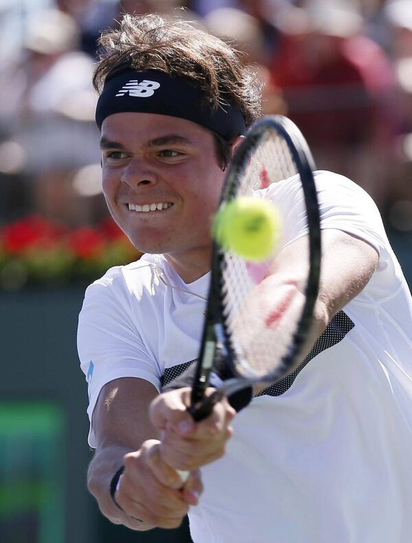 Milos Raonic of Canada returns a shot against Marin Cilic of Croatia during their match at the BNP Paribas Open ATP tennis tournament in Indian Wells, California, March 12, 2013.DANNY MOLOSHOK/Reuters