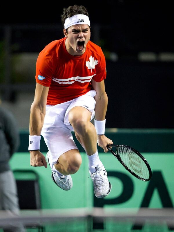 Canada's Milos Raonic, of Toronto, Ont., celebrates after defeating Italy's Andreas Seppi during the fourth set of a Davis Cup tennis quarter-final singles match in Vancouver, B.C., on Sunday April 7, 2013.DARRYL DYCK/The Canadian Press