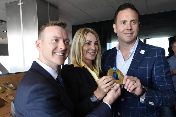 Kyle Shewfelt, Nadia Comaneci and Jean-Philippe Caron with one of the medals during the opening press conference for the FIG 2017 Artistic Gymnastics World Championships at the Montreal Tower in Olympic Park.Eric Bolte