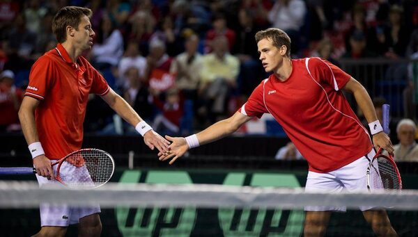 Canada's Daniel Nestor, left, of Toronto, Ont., and Vasek Pospisil, of Vernon, B.C., celebrate a point while playing Italy's Daniele Bracciali and Fabio Fognini during the first set of a Davis Cup tennis quarter-final doubles match in Vancouver, B.C., on Saturday April 6, 2013.DARRYL DYCK/The Canadian Press