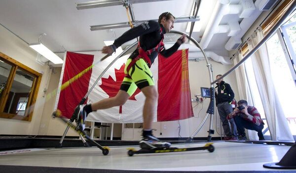 The $200,000 giant treadmill can be used by two skiers at a time and reach speeds of up to 35 kilometres an hour. It has the ability to upload data collected on race courses to simulate competition venues around the world.