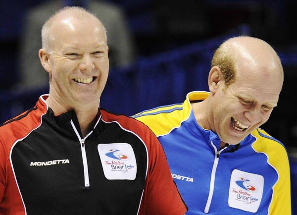 Alberta skip Kevin Martin laughs with Ontario skip Glenn Howard (L) during the 14th draw at the Brier curling championships in London, Ontario, March 10, 2011.MARK BLINCH/Reuters