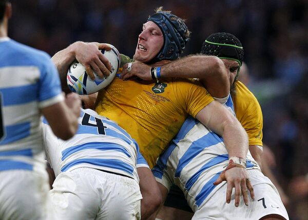Australia's David Pocock looks to pass the ball as he is tackled by Argentinian players during their Rugby World Cup semifinal match at Twickenham Stadium, London, Sunday, Oct. 25, 2015.Christophe Ena/The Associated Press