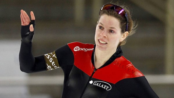 Christine Nesbitt from Canada waves after winning the Women's 1,000 meters race of the speedskating World Cup in Berlin Sunday, March 11, 2012.Michael Sohn/The Associated Press