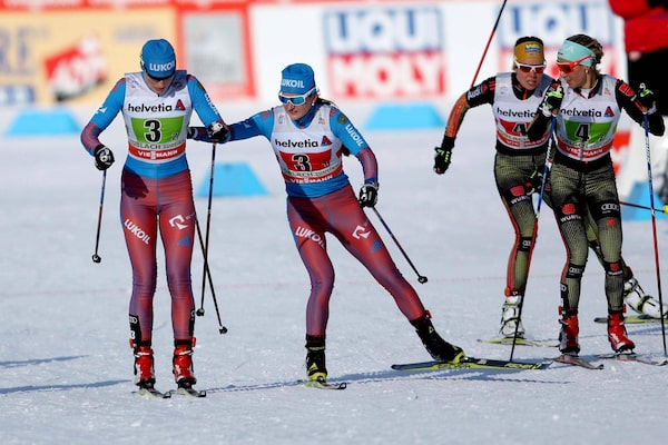 Natalia Matveeva and Yulia Belorukova of the team Russi 1 ski on their way to win the women's team sprint competition of the FIS Cross Country Skiing World Cup in Dobbiaco (Toblach), Italy, Sunday Jan. 15, 2017.Andrea Solero/The Associated Press