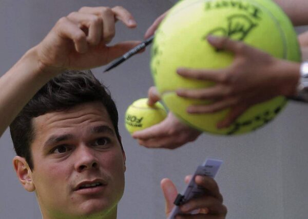 Milos Raonic from Canada signs autographs after defeating Nikolay Davydenko of Russia during the Madrid Open tennis tournament, in Madrid, Monday, May 6, 2013.Andres Kudacki/The Associated Press