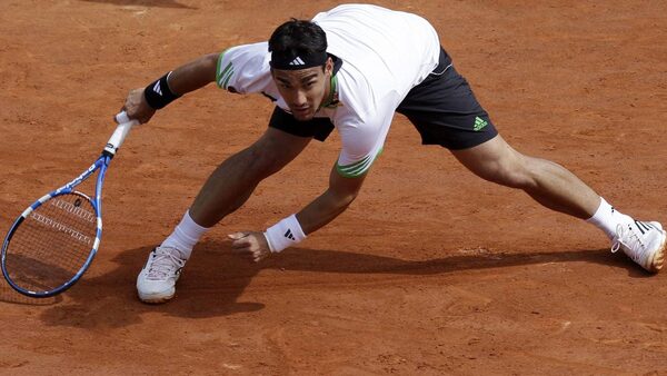 Italy's Fabio Fognini slips on the clay as he plays as he plays Spain's Albert Montanes during their fourth round match. Fognini won 4-6, 6-4, 3-6, 6-3, 11-9. (AP Photo/Lionel Cironneau)Lionel Cironneau/The Associated Press