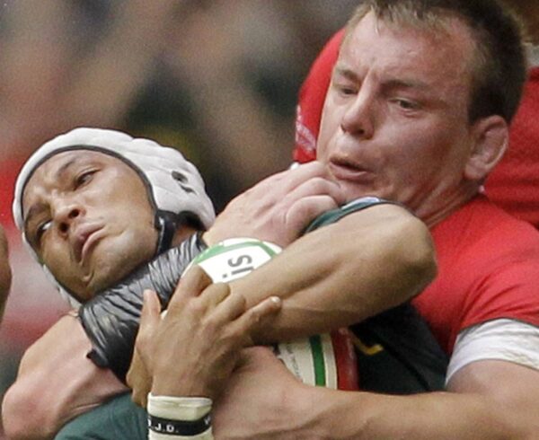 Wales' Matthew Rees, right, tackles South Africa's Gio Aplon during the international rugby union match between Wales and South Africa at the Millennium Stadium in Cardiff, Saturday, June 5, 2010. (AP Photo/Matt Dunham)Matt Dunham/The Associated Press