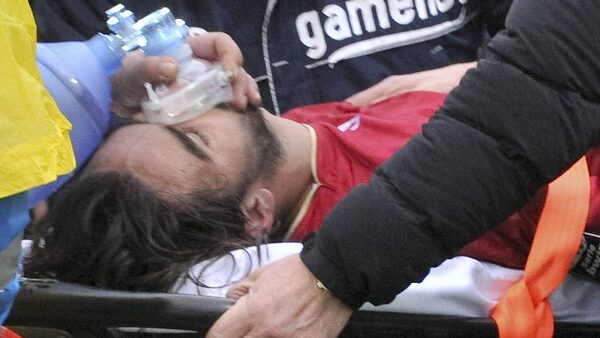 Medics assist Livorno's Piermario Morosini at the Pescara's Adriatico stadium, central Italy, Saturday, April 14, 2012, after he collapsed during a Serie B soccer match between Pescara and Livorno. Morosini, who was on loan from Udinese, fell to the ground in the 31st minute of the match and received urgent medical attention on the pitch. A defibrillator was also used on the 25-year-old, but he was declared dead at the Pescara's hospital. The match was called off, with the other players leaving the field in tears. (AP Photo/Cristiano Chiodi, Lapresse)Cristiano Chiodi/The Associated Press