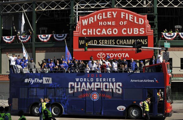 In this Nov. 4, 2016, file photo, a bus carrying Chicago Cubs players, family and friends passes Wrigley Field during a parade honoring the World Series champion baseball team in Chicago. The Cubs’ first World Series title since 1908 is the runaway winner for top sports story of 2016.Paul Beaty/The Associated Press