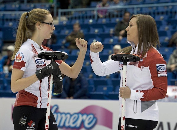 Canada skip Rachel Homan (right) and second Alison Kreviazuk tap fists as they play China at the Ford World Women's Curling Championships in Saint John, N.B. on Thursday, March 20, 2014. Kreviazuk is leaving the team at the end of the season in order to move to Sweden to be with her boyfriend.Andrew Vaughan/The Canadian Press
