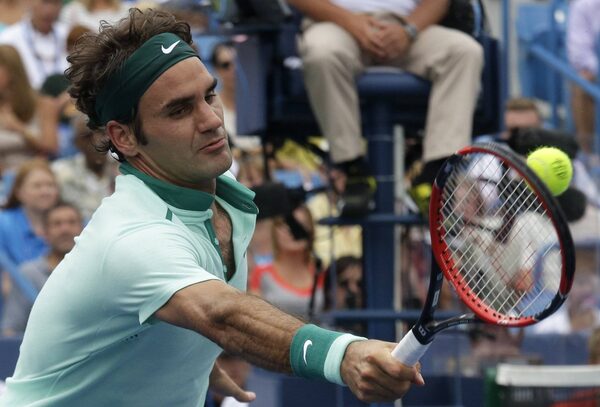 Roger Federer, from Switzerland, volleys against David Ferrer, from Spain, during a final match at the Western & Southern Open tennis tournament, Sunday, Aug. 17, 2014, in Mason, Ohio.The Associated Press