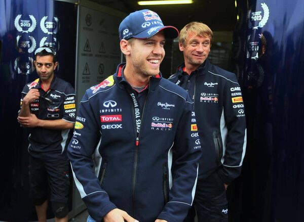 Red Bull Formula One driver Sebastian Vettel (C) of Germany smiles outside the paddocks ahead of the Canadian F1 Grand Prix at the Circuit Gilles Villeneuve in Montreal, June 6, 2013. The Canadian F1 Grand Prix will take place on June 9.CHRISTINNE MUSCHI/Reuters