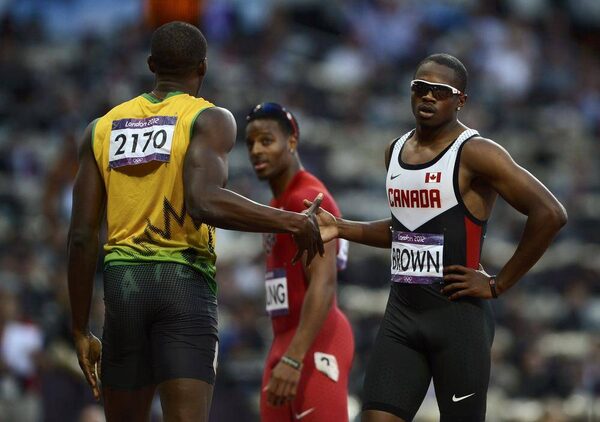 Canada's Aaron Brown (R) shakes hands with Jamaica's Usain Bolt after their men's 200m semi-final during the London 2012 Olympic Games at the Olympic Stadium August 8, 2012. REUTERS/Dylan Martinez (BRITAIN - Tags: OLYMPICS SPORT ATHLETICS)DYLAN MARTINEZ/Reuters