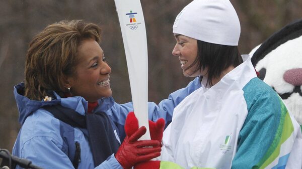 Governor General Michaelle Jean and 2010 Olympic hopeful Veronique Fortin unveil the Olympic torch at an event marking the one-year countdown for the 2010 Olympic games in Vancouver British Columbia, in Ottawa Thursday, Feb. 12, 2009. On Friday Fortin recorded her first Canadian cycling victory in Milton, Ont. THE CANADIAN PRESS/Tom HansonTom Hanson/The Canadian Press