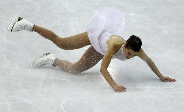 Alissa Czisny of the U.S. falls while performing during the women's free skating event at the ISU World Figure Skating Championships in Nice March 31, 2012.JEAN-PAUL PELISSIER/Reuters