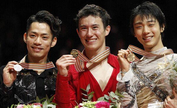 Daisuke Takahashi, left, of Japan, Patrick Chan, centre, of Canada and Yuzuru Hanyu of Japan celebrate during the medal ceremony for the men's event at the ISU World Figure Skating Championships in Nice March 31, 2012.JEAN-PAUL PELISSIER/Reuters