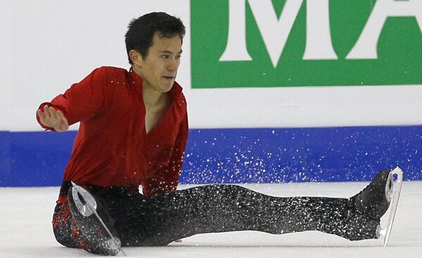 Patrick Chan of Canada falls on the ice as he performs during his Men Free skating at the ISU 2012 World Figure Skating Championships in Nice, southern France, Saturday, March 31, 2012.Francois Mori/The Associated Press