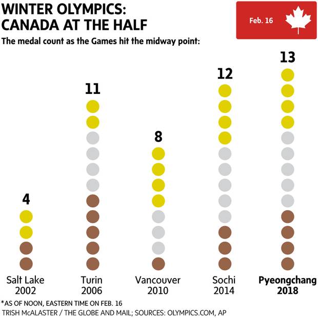 Saturday marked the halfway point of the Pyeongchang Games, which end on Feb. 25. Here's how Canada's medal tally looked.