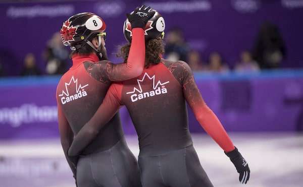 Canada's Charles Hamelin, left, and teammate Samuel Girard skate away following the men's 1500 metre short track race at the 2018 Winter Olympics in Gangneung, South Korea, Saturday, February 10, 2018.Paul Chiasson/The Canadian Press
