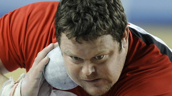 Canada's Dylan Armstrong makes an attempt at the Men's Shot Put qualification during the World Indoor Athletics Championships in Istanbul, Turkey, Friday, March 9, 2012.Martin Meissner/AP