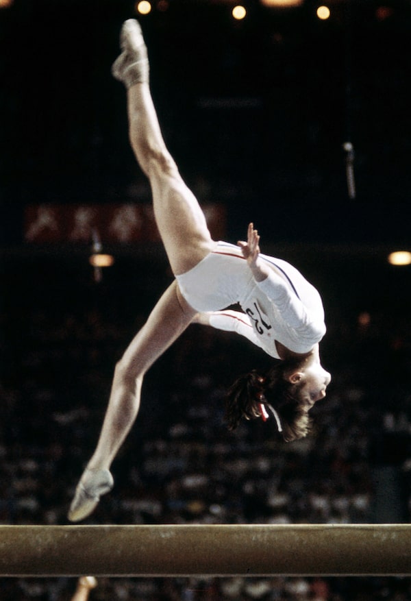 Romanian gymnast Nadia Comaneci, then 14, performs at a beam event at the 1976 Montreal Olympics.AFP/Getty Images