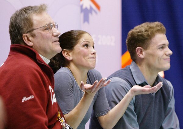 Olympians Jamie Salé, middle, and David Pelletier, right, react with coach Jan Ullmark to their unexpectedly low scores in free skating at the 2002 Salt Lake City Games.Rick Wilking/Reuters