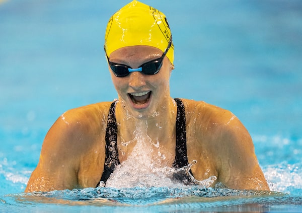Summer McIntosh smiles during the breaststroke leg on her way to breaking the World Record in the women's 400m IM at the Canadian Olympic Swim Trials in Toronto on May 16, 2024.Frank Gunn/The Canadian Press
