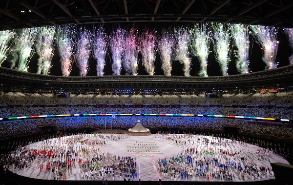 Fireworks mark the end of the parade of athletes at the Tokyo Olympics opening ceremonies at Olympic Stadium.Melissa Tait/The Globe and Mail