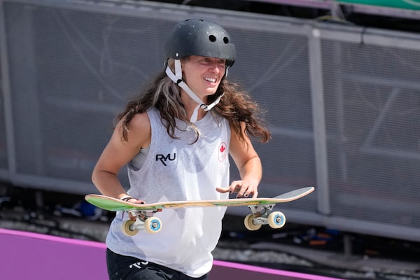 Annie Guglia of Canada smiles after the first heat in the women's street skateboarding final at the Tokyo Olympics.Ben Curtis/The Associated Press