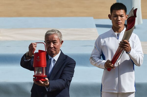 Vice President of the Chinese Olympic Committee Yu Zaiqing holds the Olympic flame during a ceremony at Panathinean stadium, in Athens, on Oct. 19.LOUISA GOULIAMAKI/AFP/Getty Images