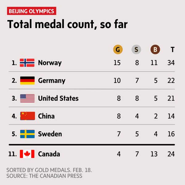 Good morning! Canada added two silver and two bronze medals to its tally in Beijing, with podium finishes in speed skating, curling, and the freeski halfpipe (Eileen Gu took the gold in the latter, her third medal). Meanwhile, Norway continues its overall dominance in the Winter Games, capturing its 15th gold medal these Olympics and setting a new record.