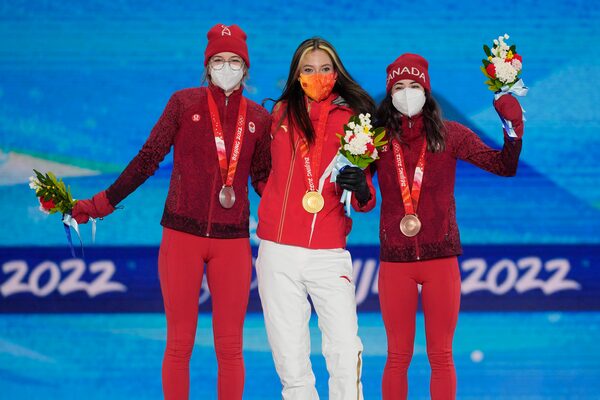 From left, Canadian silver medalist Cassie Sharpe, gold medalist Eileen Gu of China and Canadian bronze medalist Rachael Karker pose during a medal ceremony for the women's freestyle skiing halfpipe competition on Friday.Aaron Favila/The Associated Press