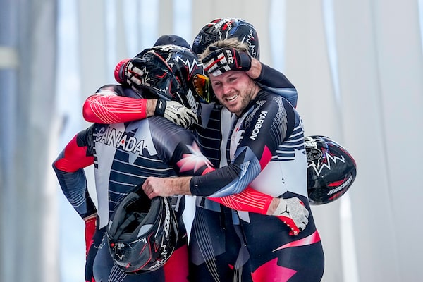 Justin Kripps, Ryan Sommer, Cam Stones and Benjamin Coakwell, of Canada, celebrate after the four-man heat at the 2022 Winter Olympics, Sunday, Feb. 20, 2022, in the Yanqing district of Beijing.Pavel Golovkin/The Associated Press