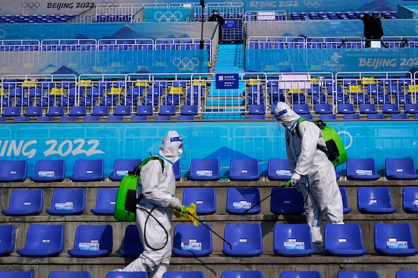 Workers in protective gear disinfect seats following the men's freestyle skiing big air finals at the Beijing Olympics, on Feb. 9.Jae C. Hong/The Associated Press