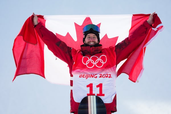 Canada's Max Parrot, of Bromont, Que., celebrates his gold medal performance following the men's slopestyle final at the Beijing Winter Olympic Games, in Zhangjiakou, China, Monday, Feb. 7, 2022.Sean Kilpatrick/The Canadian Press