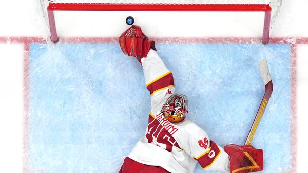 China's goalkeeper Jieruimi Shimisi reaches for a goal by United States' Brian Oneill during a preliminary round men's hockey game at the 2022 Winter Olympics on Feb. 10, 2022.Matt Slocum/The Associated Press