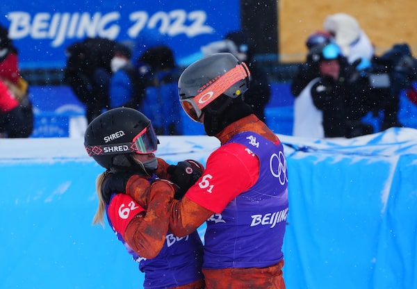 Canada's Meryeta O'Dine and Eliot Grondin celebrate their bronze medal in mixed team snowboard cross at the 2022 Beijing Winter Olympics in Zhangjiakou, China on Saturday, Feb. 12, 2022.Sean Kilpatrick/The Canadian Press