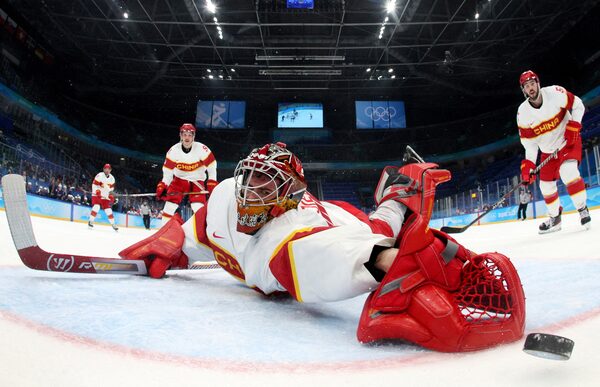 2022 Beijing Olympics - Ice Hockey - Men's Prelim. Round - Group A - United States v China - National Indoor Stadium, Beijing, China - February 10, 2022. Jieruimi Shimisi of China reacts to a goal. Pool via REUTERS/Bruce Bennett TPX IMAGES OF THE DAYBRUCE BENNETT/Reuters