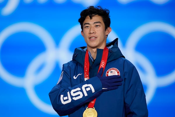 Gold medalist Nathan Chen of the United States stands for his national anthem during the medal ceremony for the men's free skate figure skating on Thursday, Feb. 10, 2022, in Beijing.Jae C. Hong/The Associated Press