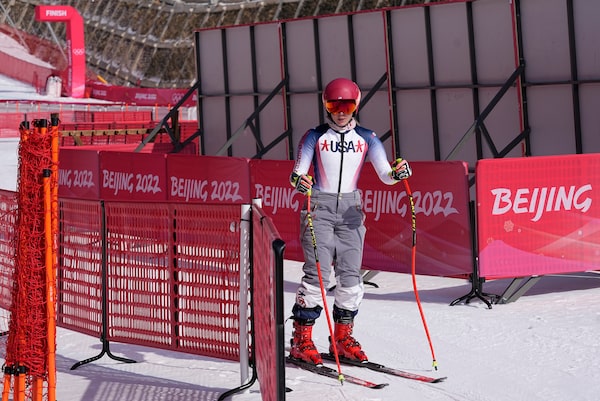 Mikaela Shiffrin of the United States walks through the finish area after a training run at the 2022 Winter Olympics, Thursday, Feb. 10, 2022.Luca Bruno/The Associated Press