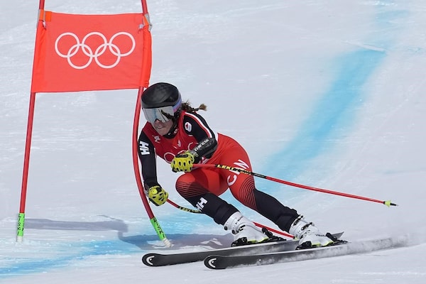 Marie-Michele Gagnon, of Canada makes a turn during the women's super-G at the 2022 Winter Olympics, Friday, Feb. 11, 2022, in the Yanqing district of Beijing.The Associated Press